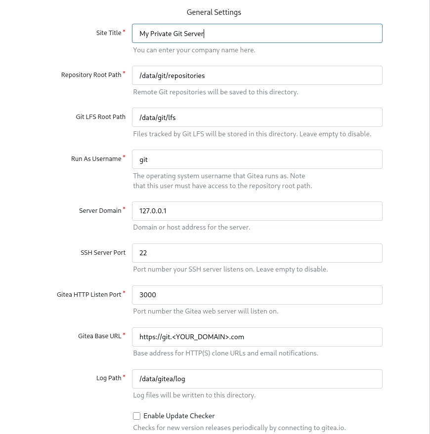 As you can see, I’ve specified a different SSH port for the Gitea builtin SSH server in order to avoid conflicts with