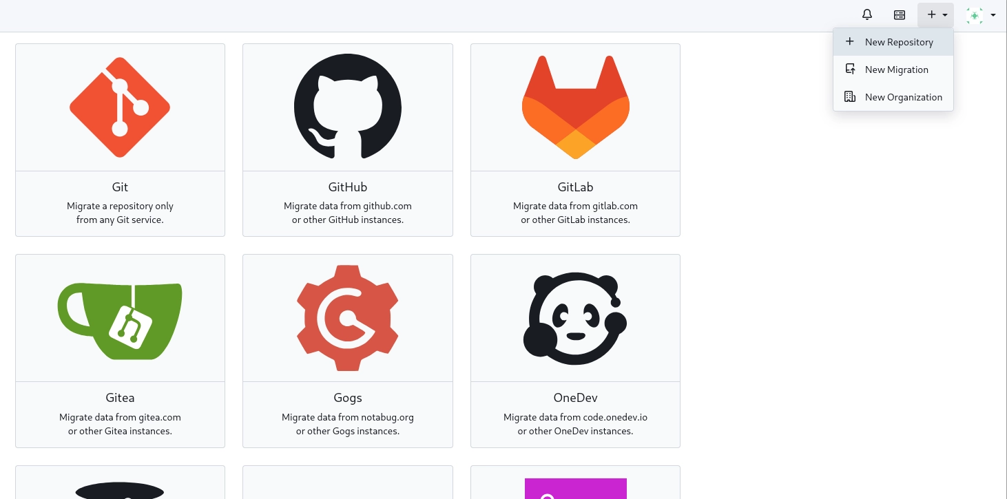 To migrate repositories from another Git platform (such as GitHub, GitLab, etc.), go to the top-right “plus symbol”, click on “New Repository”, then “migrate repository”. From there, you can easily transfer your existing repository following the interactive interface.