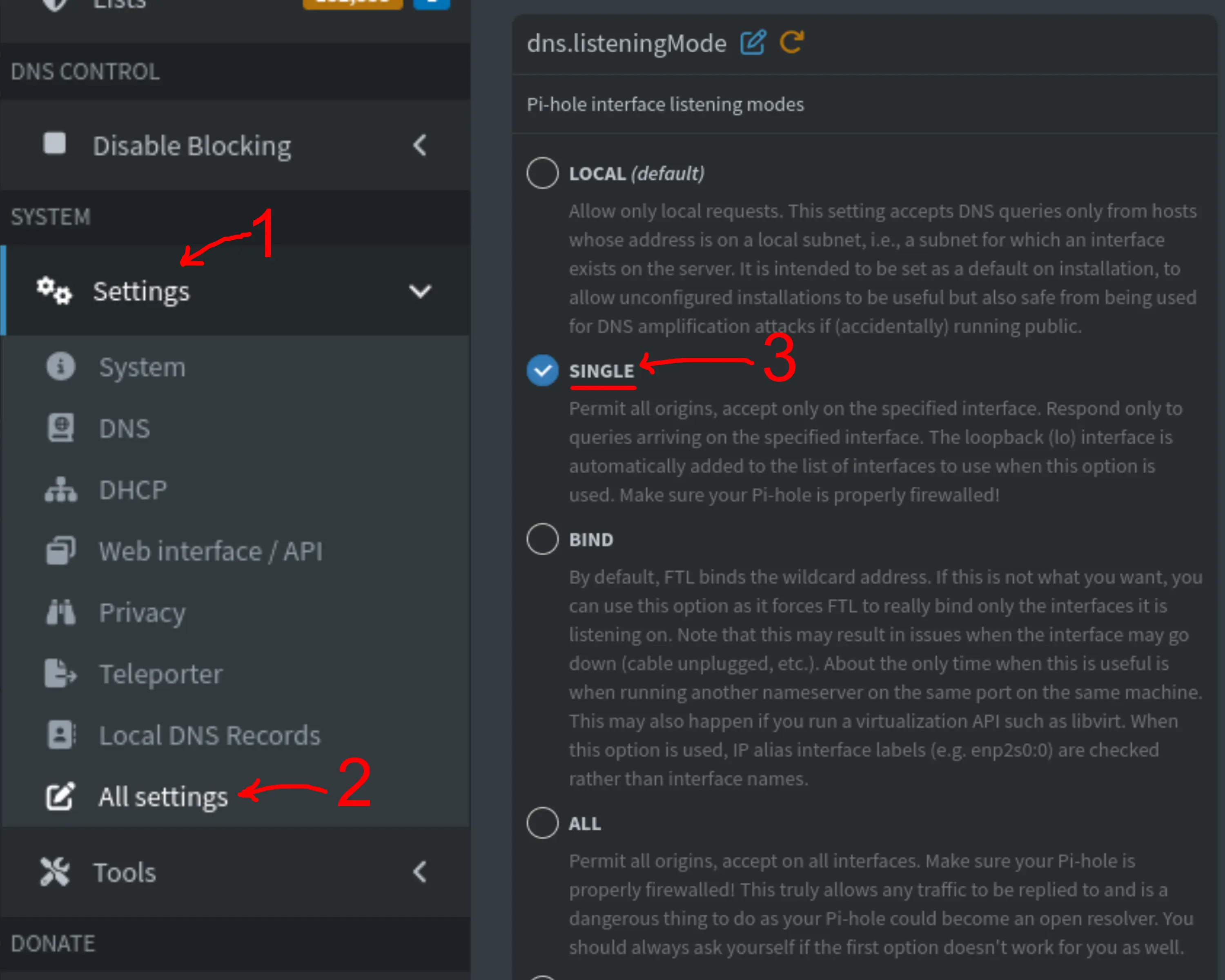 dns.listeningModeand select theSINGLEoption; - Click on the “Save & Apply” button on the bottom right corner.